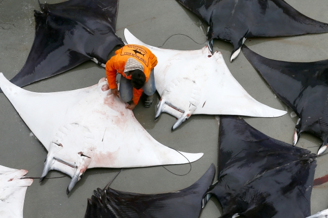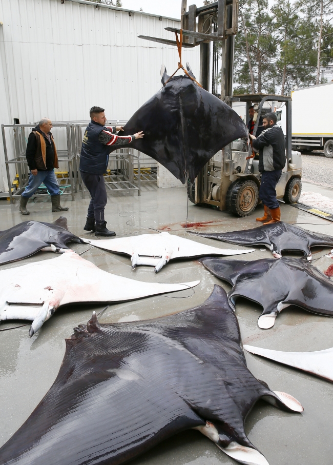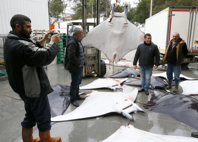 Akdeniz açıklarında avlanan balıkçıların yaklaşık 3 metre genişliğinde, 150 ile 200 kilogram ağırlığında yakaladığı vatozlar görenleri şaşırtıyor.