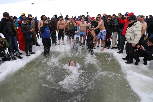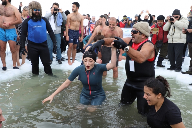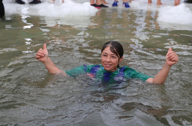Katılımcılardan 40'ı suya girmeye cesaret edebildi. Dondurucu suda yüzen katılımcılar, çay içerek ısınmaya çalıştı.