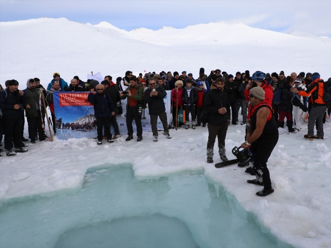 Ovit Yaylası'nda buluşan doğa meraklıları, yaklaşık bir saatlik yürüyüşün ardından Ovit Buzul Gölü'ne ulaştı. Suyun tamamen donduğu Buzul Gölü'ndeki buzlar ağaç motoruyla kesilip, levyelerle kırıldı.
