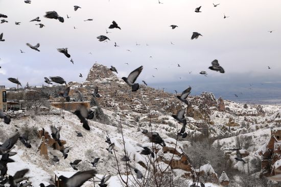 Peribacaları, doğal kaya oluşumları, mağara otelleri ve kayadan oyma tarihi mekanlarıyla ünlü Türkiye'nin önemli turizm merkezlerinden Kapadokya, kar yağışı sonrası beyaz bir örtüye büründü.