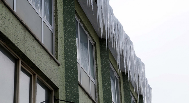 Uyarı anonsları yapan belediye ekipleri, işlek caddelerde çatılardaki buz sarkıtlarını temizledi.