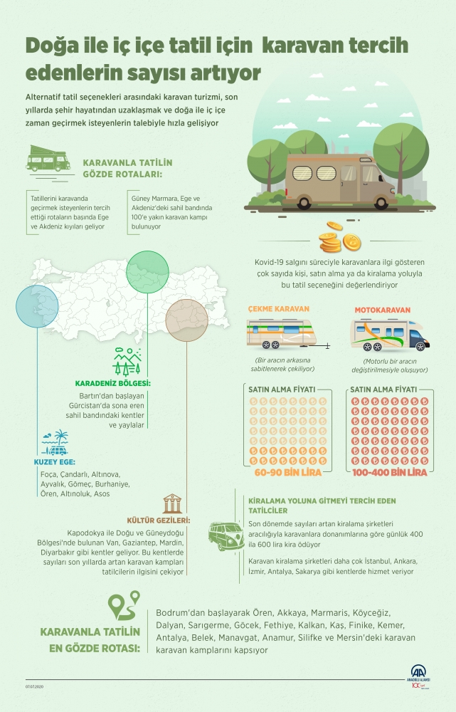 Karavanla tatilin en gözde rotası ise Bodrum'dan başlayarak Ören, Akyaya, Marmaris, Köyceğiz, Dalyan, Sarıgerme, Göcek, Fethiye, Kalkan, Kaş, Finike, Kemer, Antalya, Belek, Manavgat, Anamur, Silifke ve Mersin'deki karavan kamplarını kapsıyor.