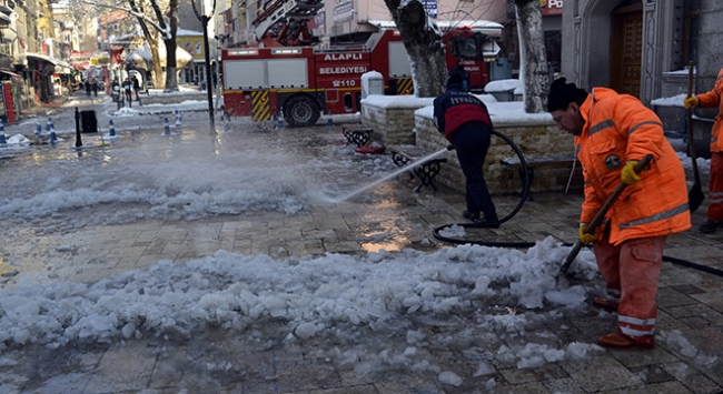 Alaplı Belediyesi ekipleri, buzla mücadele ve yolların kardan temizlenmesi için tuz dökmek yerine denizden çektikleri suyu itfaiye araçlarıyla cadde ve sokaklara püskürterek temizleme çalışması yaptı.