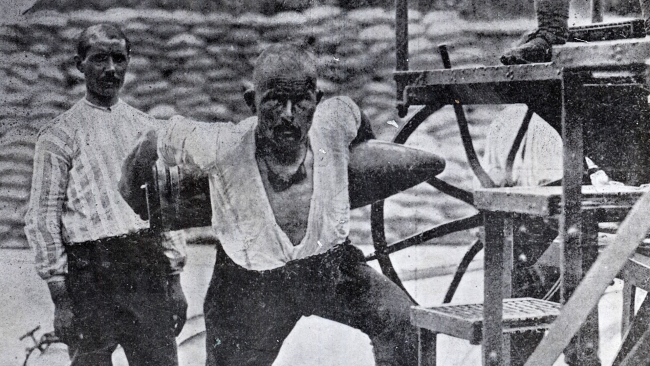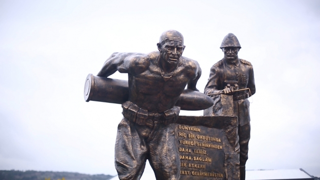 Her biri 215 kilogram olan top mermilerini kucaklayan Seyit Ali Çubuk, mermileri top kundağına yerleştirdi.