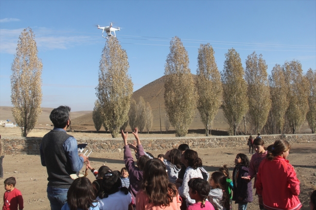 Kars'ın Arpaçay ilçesinde öğrencilere hediye götüren gönüllü ekibin, çekim için havalandırdığı drone, çocuklardan büyük ilgi gördü.