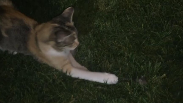 Kedi, zaman zaman ağzıyla taşıdığı küçük hayvanı öldürmezken, uzun süre keyifle oynadı.