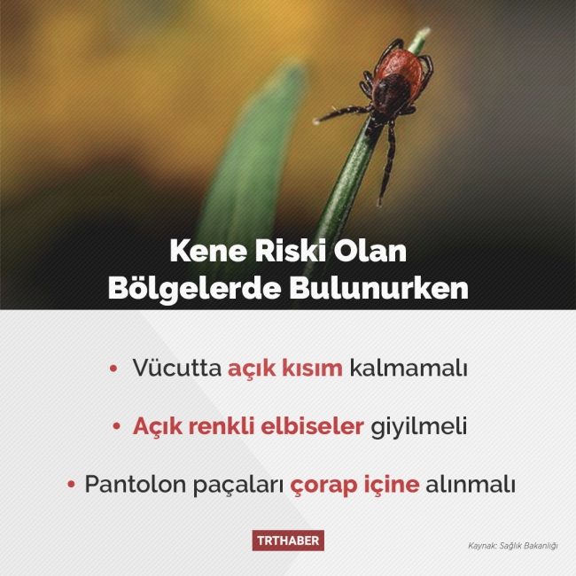 Keneden korunmak için kırsal alanlara giderken vücudun açık kısmının kalmamasına dikkat edilmeli. Özellikle açık renkli kıyafetler giymek kenelerin daha kolay fark edilmesini sağlıyor.