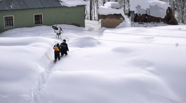 Köydeki evler kardan kaybolmuş. Çatılardan inen karlar büyük tehlike oluşturuyor.