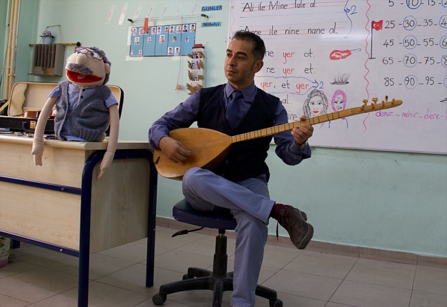 İlçedeki Yaşar Doğu İlkokulunda sınıf öğretmenliği yapan Çuğu, öğrencilere okumayı ve matematiği daha keyifli öğretebilmek için kukla ve enstrüman kullanıyor.