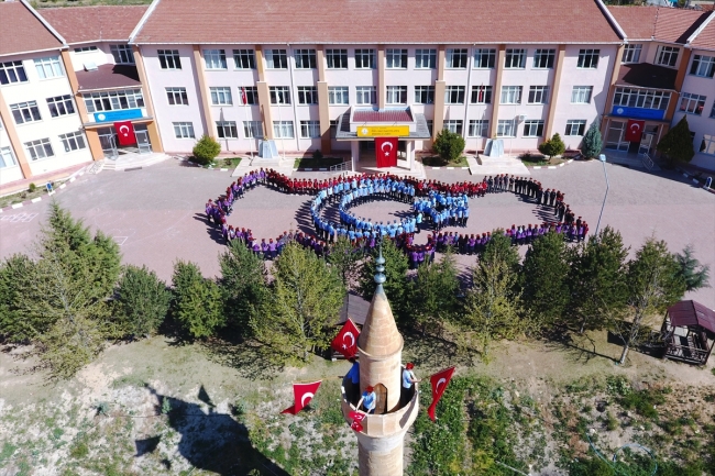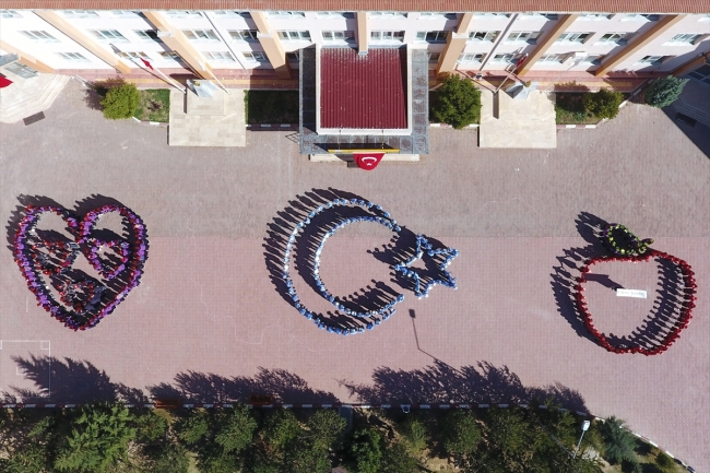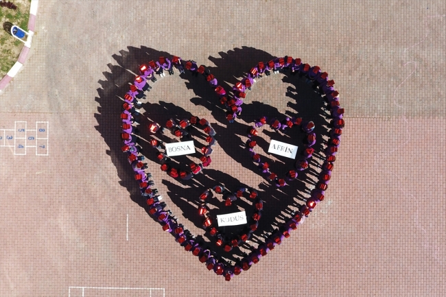 Öğrenciler, ünlü sanatçıların seslendirdiği, "Türkiye Marşı" eşliğinde "Kızıl Elma, kalbimiz Bosna, Kudüs ve Afrin için atıyor" temalı figürleriyle görsel şölen oluşturdu.