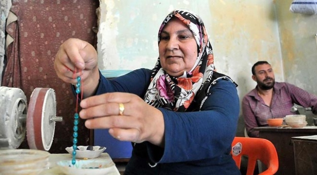 Şanlıurfa'da 60 yaşındaki ev kadını Hatice Gelmiş, Şanlıurfa Büyükşehir Belediyesinden aldığı mikro krediyle açtığı tespih atölyesinde damadına ve 3 çocuğuna iş olanağı sağladı.