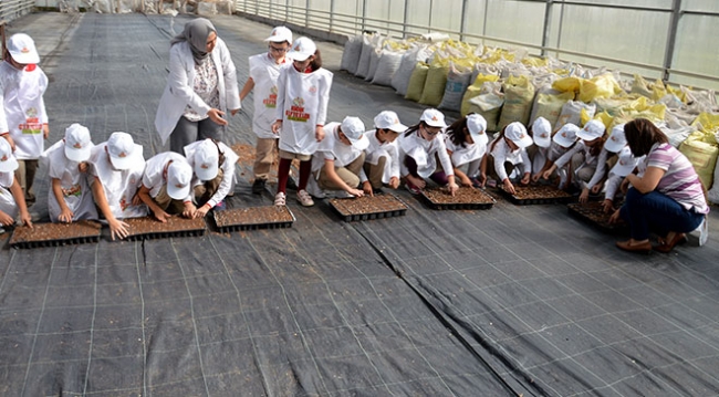 Bekir Sıtkı Durgun İlkokulu öğrencileri, küçük çiftçiler toprakla buluşuyor projesi kapsamında Mısır Araştırma Enstitüsü'nde kendileri için hazırlanan bölümde tohumları toprakla buluşturdu.