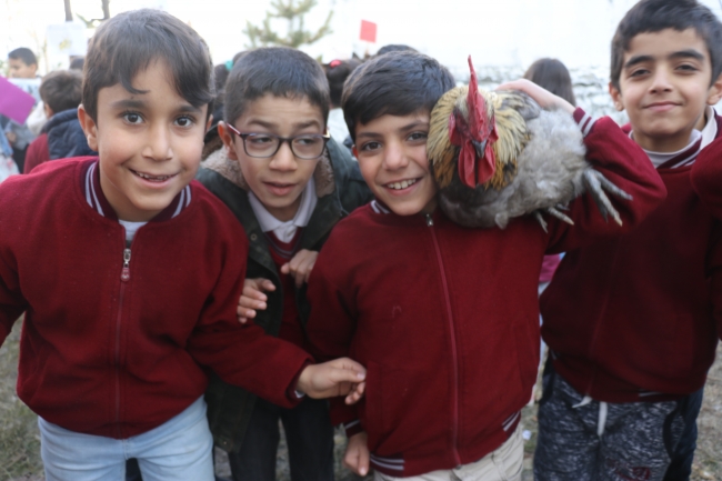 Ders saatinde kuş ve balık türlerinin bulunduğu sınıflarda can dostlarıyla eğitim gören öğrenciler, teneffüste ise bahçedeki tavuk, horoz ve ördeklerle oynayarak vakit geçiriyor.