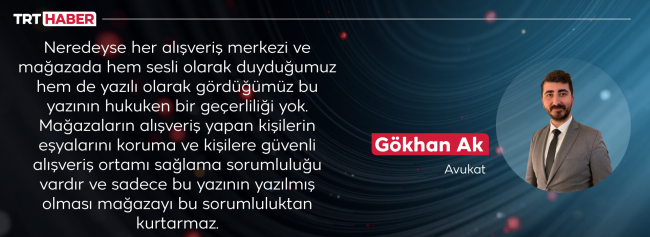 “Neredeyse her alışveriş merkezi ve mağazada hem sesli olarak duyduğumuz hem de yazılı olarak gördüğümüz bu yazının hukuken bir geçerliliği yok.  Mağazaların alışveriş yapan kişilerin eşyalarını koruma ve kişilere güvenli alışveriş ortamı sağlama sorumluluğu vardır ve sadece bu yazının yazılmış olması mağazayı bu sorumluluktan kurtarmaz.”