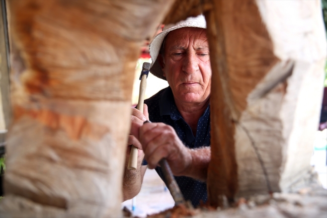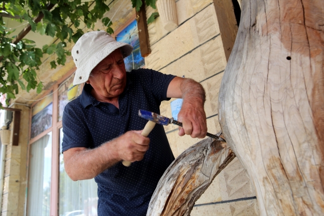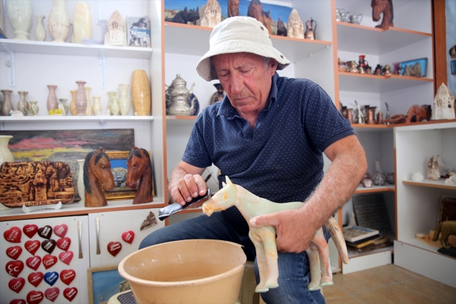Çocukluğundan bu yana bölgede sanatını icra eden Eren, irili ufaklı ahşap ve taşları oyarak turistlerin ilgisini çeken nadide eserlere imza atıyor.
