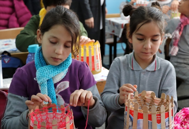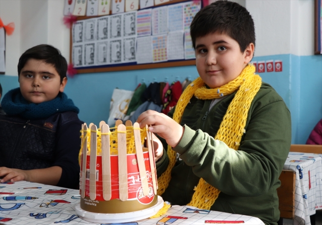 Atık yoğurt kaplarından hazırladıkları kasnaklarda ilmek ilmek ördükleri 30 parça giyim eşyasını hediye paketi yapan öğrenciler, kardeşlerinin yeni yıllarını kutlayan notlar da yazdı.