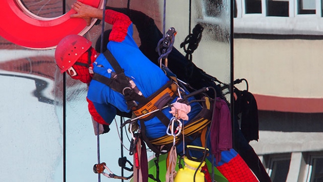 Eskişehirli bir dağcı, çizgi karakter olan ve beyaz perdeye de uyarlanan kurgusal kahraman "Örümcek Adam" kostümüyle 3 yıldır profesyonel olarak dış cephede cam temizliği yapıyor.
