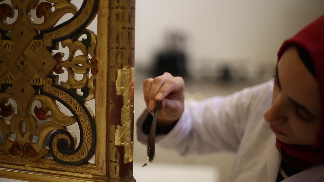 “Kurumumuz bünyesindeki saray, köşk ve kasırlara ait objelerin restorasyonlarını yapıyoruz. Eserler atölyemize geldiğinde önce arşivleme çalışmaları gerçekleştiriliyor, fotoğrafları çekiliyor. Ardından eser üzerindeki hasarlar tespit ediliyor. Nasıl müdahale edilmesi gerektiği gibi konularda hazırlık yapılıyor.”