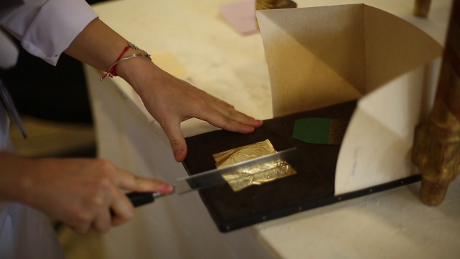 Ardından sırayı varak aşaması alıyor. Bu aşamada, tıpkı eserlerin orijinalinde olduğu gibi 23 karat altın yapraklar kullanılıyor. Yine su bazlı ve yağ bazlı yapıştırma tekniği kullanılarak eserlerin özüne sadık kalınıyor.