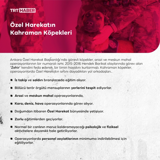 “2016 tarihinde Mardin’in Nusaybin’de Atmaca 7 operasyonunda, Belçika Malinois ırkı Özel Operasyon Köpeği ‘Zehir’, terör grubunu etkisiz hale getirip, kendini feda ederek tim personelinin hayatını kurtardı.”