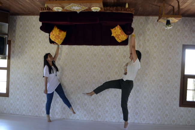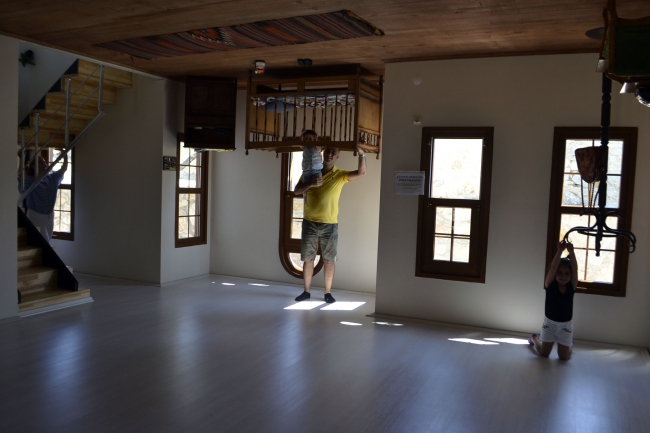 Girişimci Bilal Özdemir'in yaptığı evde kendisi, babası, dedesi ve annesinin 1980'li yıllarda kullandığı yatak, mutfak mobilyaları, dolaplar, telefon, beşik, buzdolabı gibi eşyalar tavanda yer alıyor.