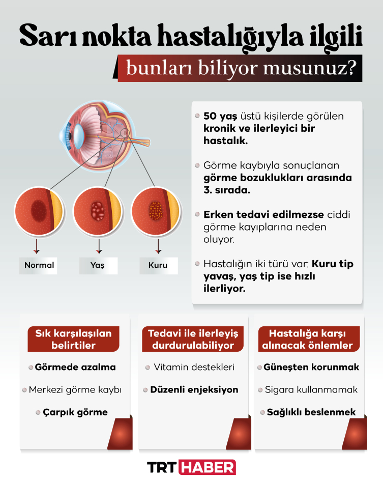 Halk arasında ''sarı nokta hastalığı" olarak bilinen yaşa bağlı makula dejeneresansı, tüm dünyada görme kaybının en önemli nedeni olarak kabul ediliyor. Nitekim Dünya Sağlık Örgütü’nün (DSÖ) verilerine göre, dünyada görme kaybıyla sonuçlanan görme bozuklukları arasında 3’üncü sırada yer alıyor. Öyle ki hastalık tüm dünyada 30 milyon kişiyi etkiliyor.