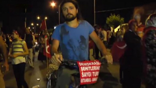 "15 Temmuz darbe girişiminde şehit olanların hikayelerinden çok etkilendim. Halkımız büyük bir kahramanlık gösterdi. Özellikle tank ve uçaklara karşı göğüslerini siper edenleri izlerken çok duygulandım. Ben de bu fedakarlıklar karşısında ne yapabilirim diye düşündüm ve onlar için İstanbul'dan Ankara'ya kadar pedal çevirdim. Şimdi burada çadır kurdum ve sabaha kadar nöbette olacağım." şeklinde konuştu.