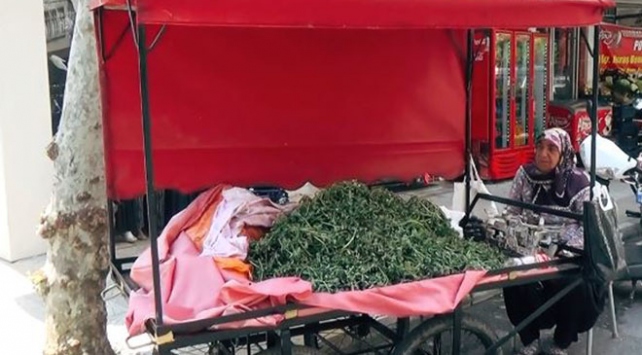 El arabasıyla sabah saatlerinde merkeze inen Fatma teyzenin iki ayağında da platin var. Ancak o sokak sokak gezerek semizotu satışı yapıyor.