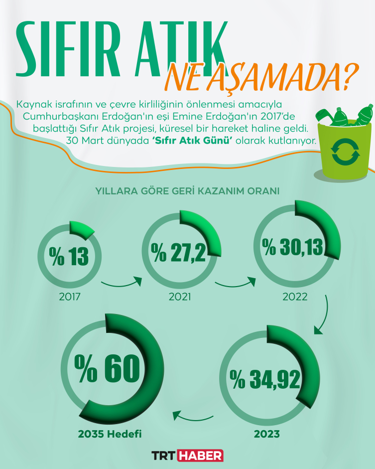 Çevre, Şehircilik ve İklim Değişikliği Bakanlığı koordinasyonuyla Sıfır Atık ülke geneline yayıldı. 81 il için ‘İl Sıfır Atık Yönetim Sistemi Planı’ hazırlandı. Bunun sonucunda 2017 yılından itibaren sıfır atık yönetimine geçen bina ve yerleşke sayısı 193 bine ulaştı. 22 milyon kişiye Sıfır Atık konusunda eğitim verilirken, 2017 yılında yüzde 13 olan geri kazanım oranı ise yüzde 34,92’ye kadar çıkarıldı. Hedef, geri kazanım oranının 2035 yılında yüzde 60’a çıkarılması.