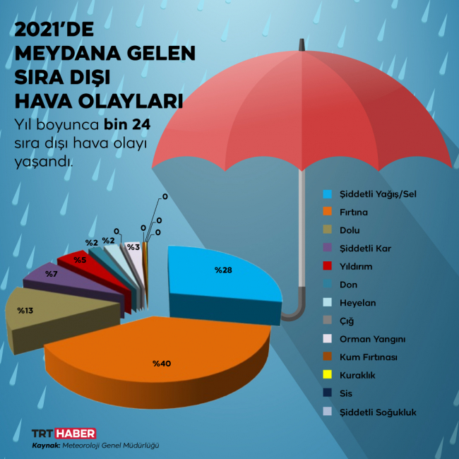 2021 yılında don olayları da heyelan da yüzde 2 oranında görüldü. Çığ, kum fırtınası, sis, şiddetli soğuk ve kuraklık ise yüzde 1’den az meydana geldi.