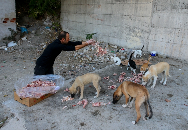 Sokakta yaşayan kedi ve köpeklerin durumuna çok üzülen Mogol, yaşadığı apartmanın önüne yiyecek bırakarak onlarla ilgilendi.