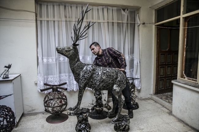 Akrabalarının kullanmadığı çatalları da toplayan Altınorak, 2 metre uzunluğunda geyik heykeli yaptı.