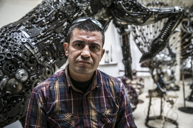 Daha önce de hurda otomobil ve motosikletlerden temin ettiği 30 bin parçadan 3 metrelik at heykeli yapan Altınorak, hurda araç malzemelerinden yaptığı flamingo, köpek, kaplumbağa ve tavus kuşu gibi hayvan heykel ve figürlerini atölyesinde sergiliyor.