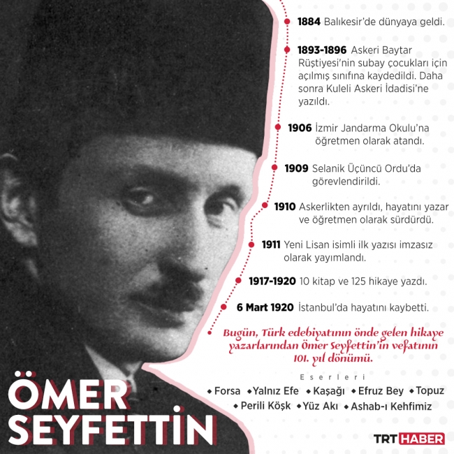 [Grafik: TRT Haber (Hafize Yurt)]Usta kalem, 1900'de İstanbul Mekteb-i Harbiye-i Şahane'ye (Harp Okulu) girdi. 1903'teki mezuniyetinin ardından kura çeken Seyfettin, merkezi Selanik'te bulunan Üçüncü Ordu'nun Redif tümenine bağlı Kuşadası Redif Taburuna atandı.