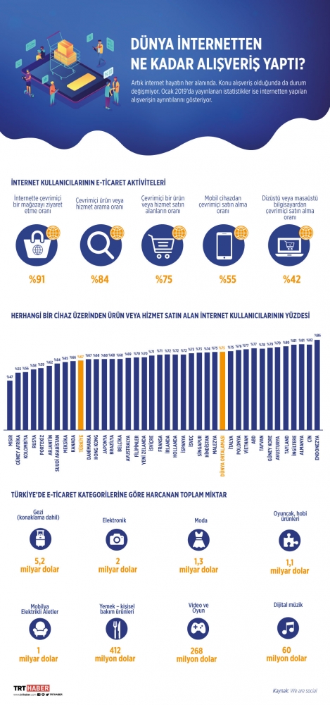82 milyon nüfuslu Türkiye’de, 59 milyon insan aktif internet kullanıyor. Ülkemizde online alışveriş yapma oranı yüzde 67. En çok parayı ise seyahat, moda ve elektronik eşyalara harcıyoruz.