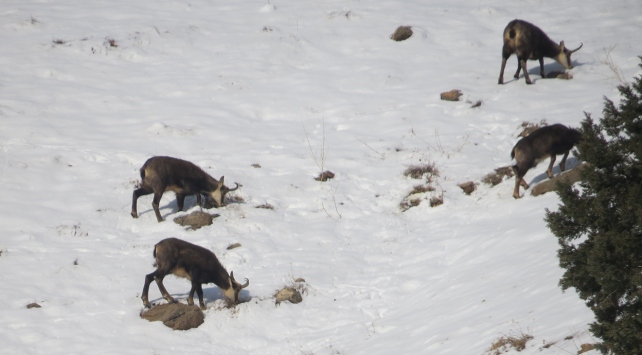 Erzincan’ın Tercan ilçesi avlak alanında inceleme yapan Doğa Koruma ve Milli Parklar personeli, şamua olarak bilinen çengel boynuzlu dağ keçilerini karlı zeminde yiyecek ararken kaydetti. Türüne az rastlanan çengel boynuzlu dağ keçisi şamuanın Bakanlık tarafından koruma altına alınan hayvanlar arasında yer aldığı belirtildi.