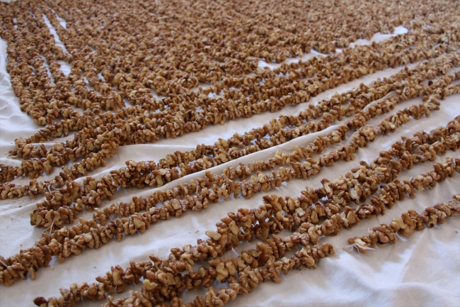 "Sonbaharda cevizleri kabuklarından ayırdıktan sonra ikiye ayırıp ipe diziyoruz. Daha sonra kendi bağımızda yetiştirdiğimiz üzümleri sıkıp suyunu çıkarıyoruz. Üzüm suyunu odun ateşinde kaynatıyoruz. Bulamaç halini aldıktan sonra, ipe dizdiğimiz cevizleri bulamaca batırıyoruz. Ardından bir hafta güneşte bekletiyoruz."