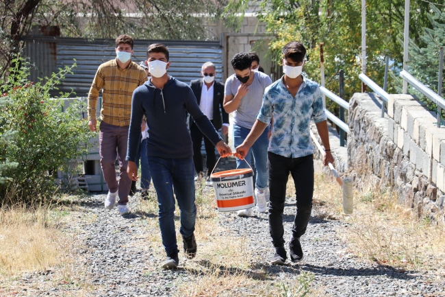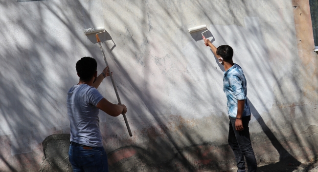 Boya temin eden öğretmen ve öğrenciler, daha sonra ellerine fırça ve boya alıp yangında zarar gören evin duvarlarını boyadılar.