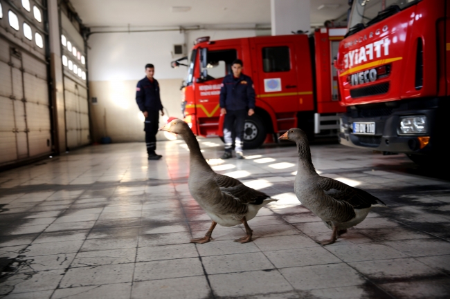 [Fotoğraf: AA]İtfaiye personeli tarafından "Ateş" ve "Su" ismi verilen 2 kaz, kimi zaman araçların bulunduğu alanda kimi zaman da personelin dinlenme odasında dolaşıyor.