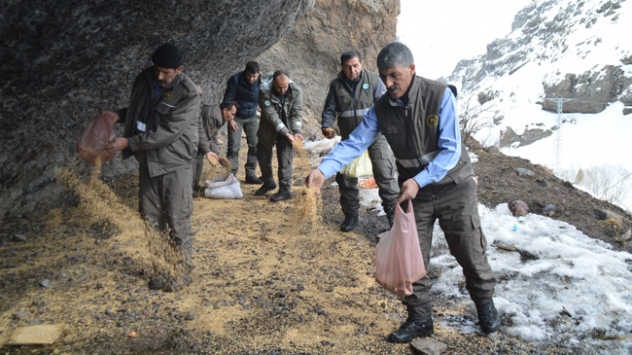 Orman ve Su İşleri Müdürlüğü Doğa Koruma ve Milli Parklar Şube Müdürlüğü ekiplerince, kar yağışı nedeniyle yiyecek bulmakta güçlük çeken yabani hayvanlar için Eleşkirt ilçesine bağlı Hayran Göl köyü kırsalında yemleme çalışması yapıldı.