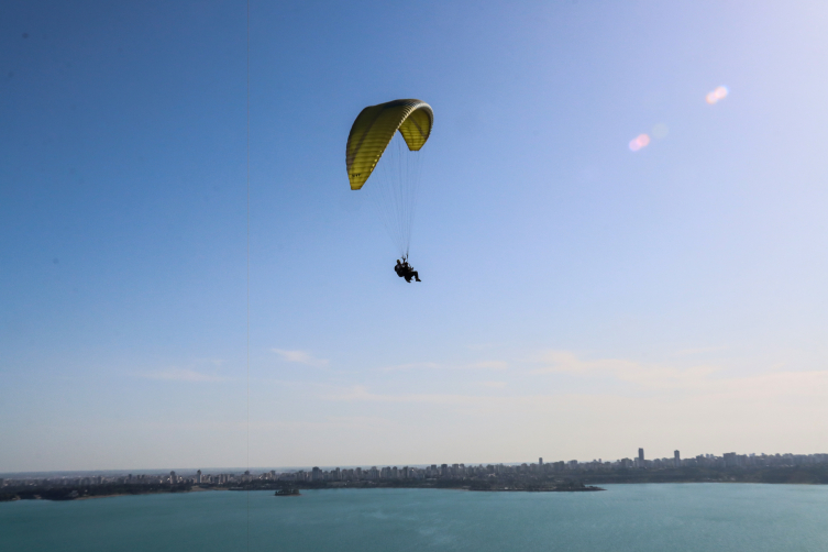 Menekşe Mahallesi'ndeki kalkış alanına giden Mehmet Ağırman ile Furkan Nizamsever, yamaçtan havalanarak paraşütle tandem uçuşu gerçekleştirdi.