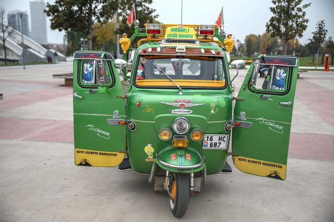 Bursa'da şehir içi otobüs şoförlüğü yapan Erol Çakmak, motorundan kaportasına birçok parçasını yenileyip süslediği 1970 model triportörüne özenle bakıyor.