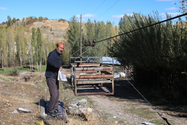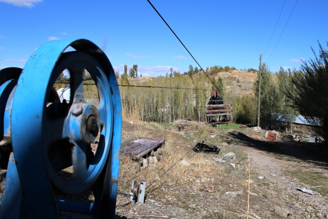 Elektrikle çalışan teleferik sayesinde bir saatlik yolu 40 saniyeye indiren Direk, 9 yıldır bu sistemle tarlasına ulaşıyor.