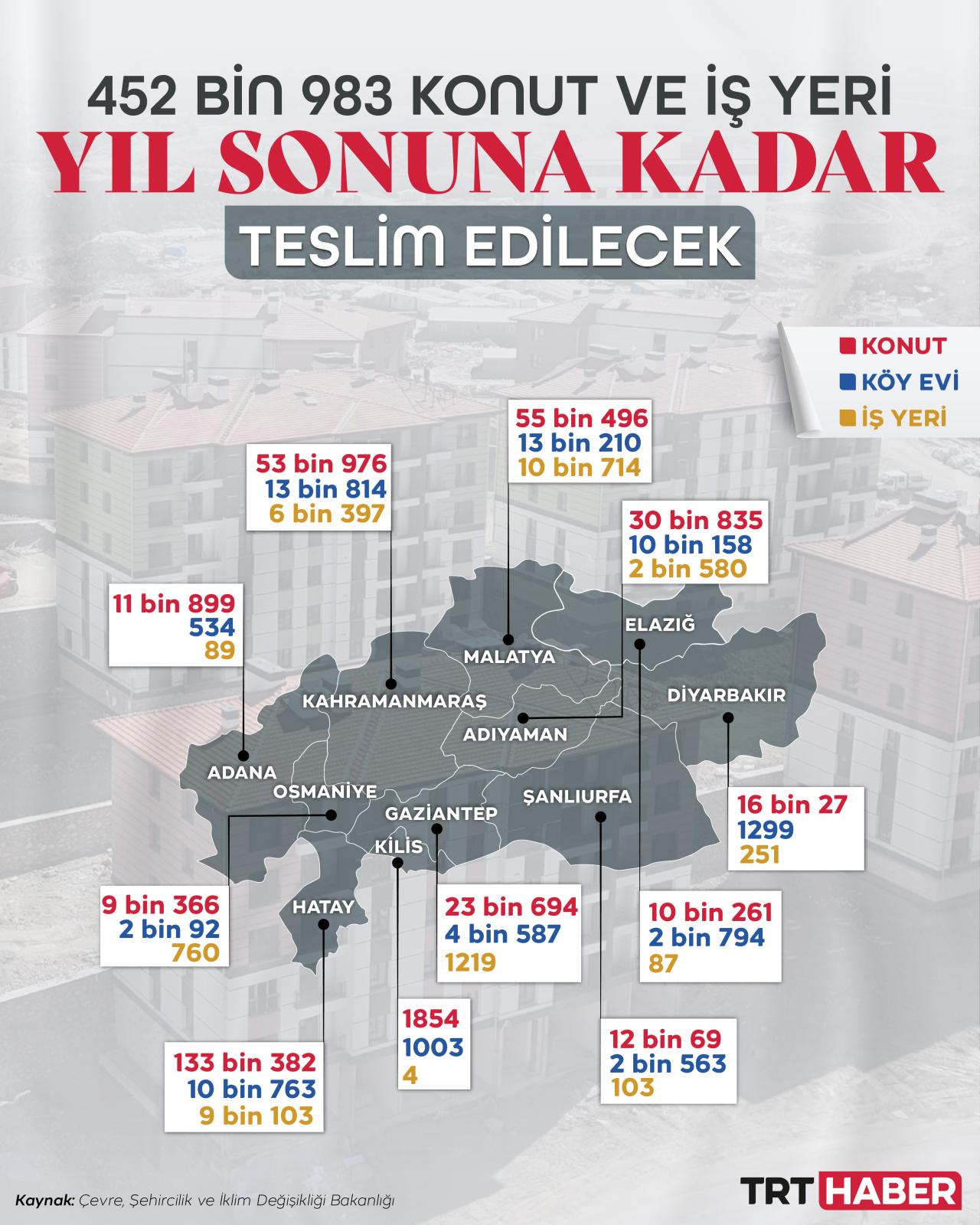 11 ilde 201 bin 580 konut ve iş yeri, depremzedelere teslim edildi. Yıl sonuna kadar 452 bin 983 bağımsız bölüm teslim edilmiş olacak.