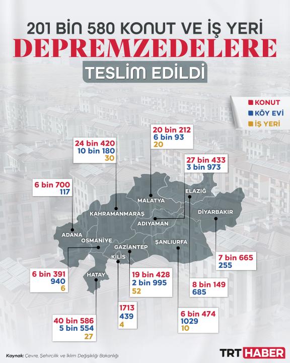 Deprem bölgesinde teslim edilen konut ve iş yeri sayısı 201 bin 580'e yükseldi