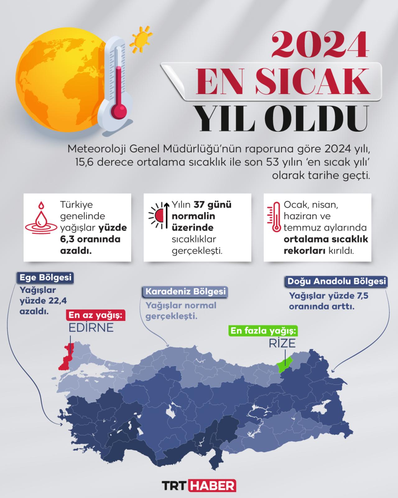 Çevre, Şehircilik ve İklim Değişikliği Bakanlığı’na bağlı Meteoroloji Genel Müdürlüğü, 2024 yılı sıcaklık ve yağış raporlarını yayımladı. 2024 yılı 15,6 derecelik ortalama sıcaklık ile son 53 yılın 'en sıcak yılı' olarak tarihe geçti.