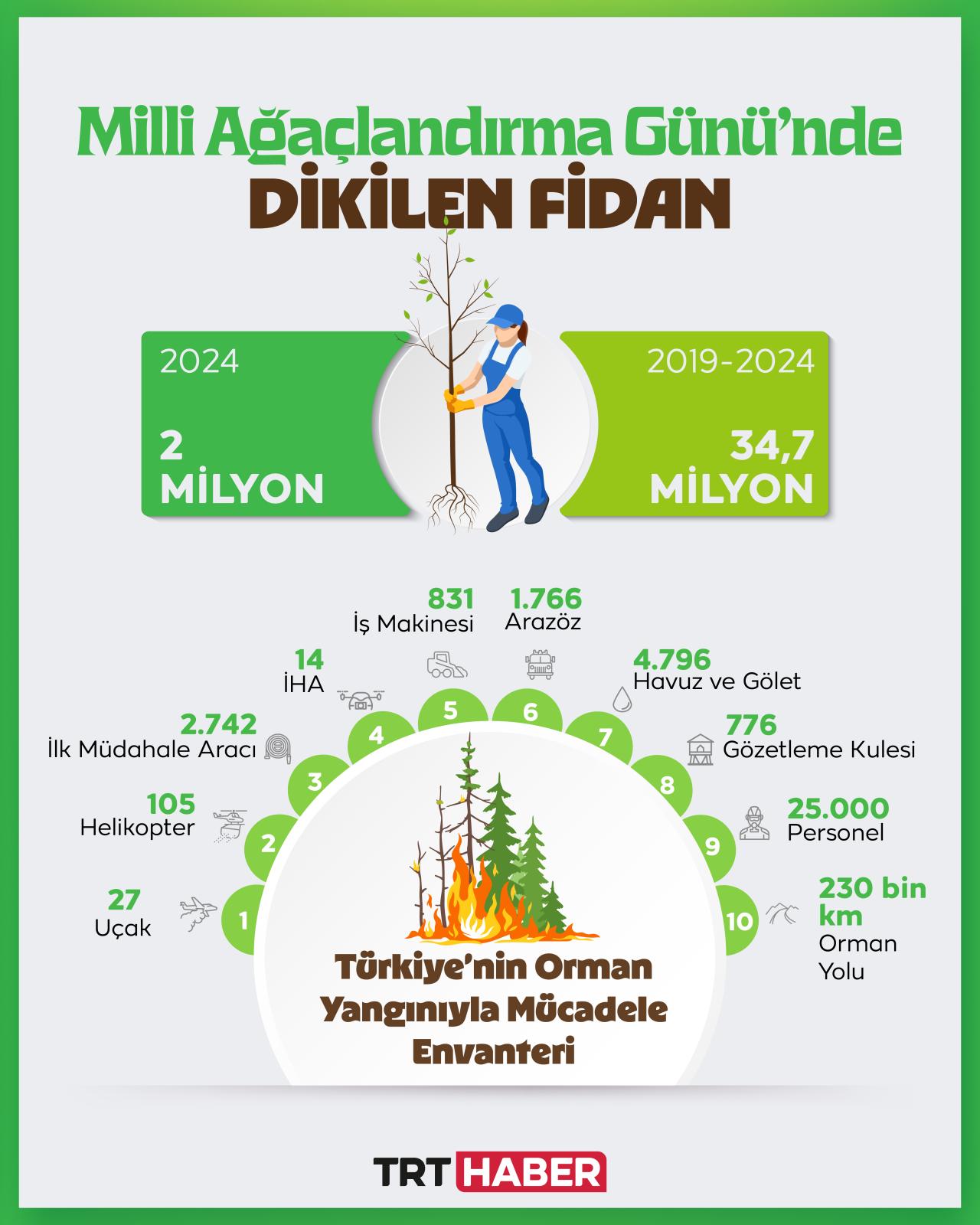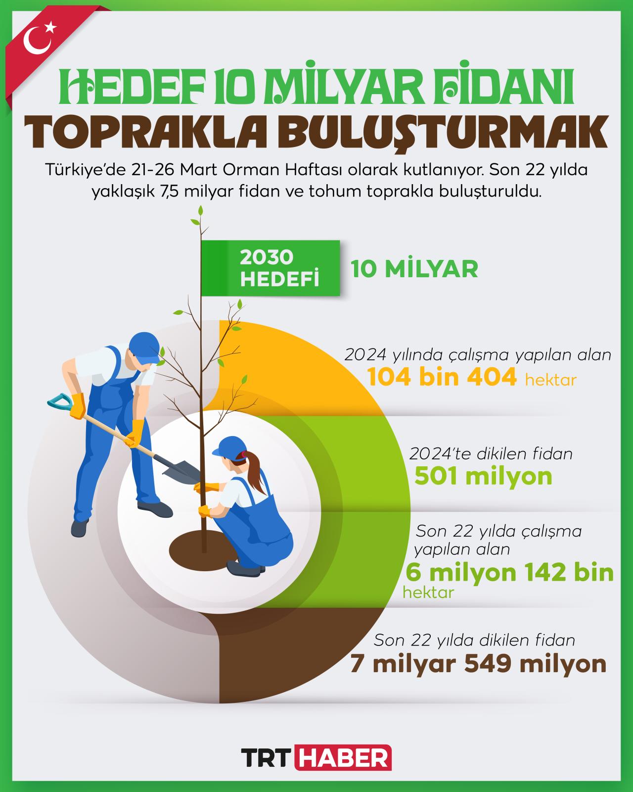Türkiye’de 22 yılda 6 milyon 142 bin hektar alanda ağaçlandırma çalışması yapıldı ve yaklaşık 7 buçuk milyar fidan ve tohum toprakla buluşturuldu. Hedef, 2030 yılına kadar bu sayısı 10 milyara ulaştırmak. 2024’te toprakla buluşturulan fidan sayısı ise 501 milyonu geçti.