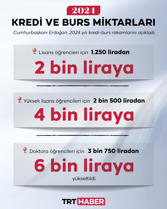 Cumhurbaşkanı Recep Tayyip Erdoğan, yüksek öğrenimdeki öğrencilerin aldığı kredi ve bursların artırıldığını açıkladı. 2024'te, lisans öğrencileri 2 bin lira, yüksek lisans öğrencileri 4 bin lira, doktora öğrencileri ise 6 bin lira alacak.