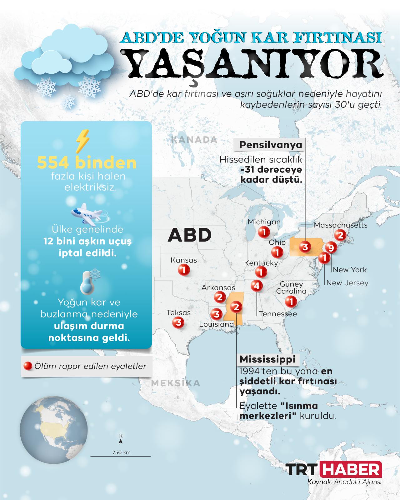 ABD'de kar fırtınası ve aşırı soğuklar nedeniyle hayatını kaybedenlerin sayısı 30'u geçti.
