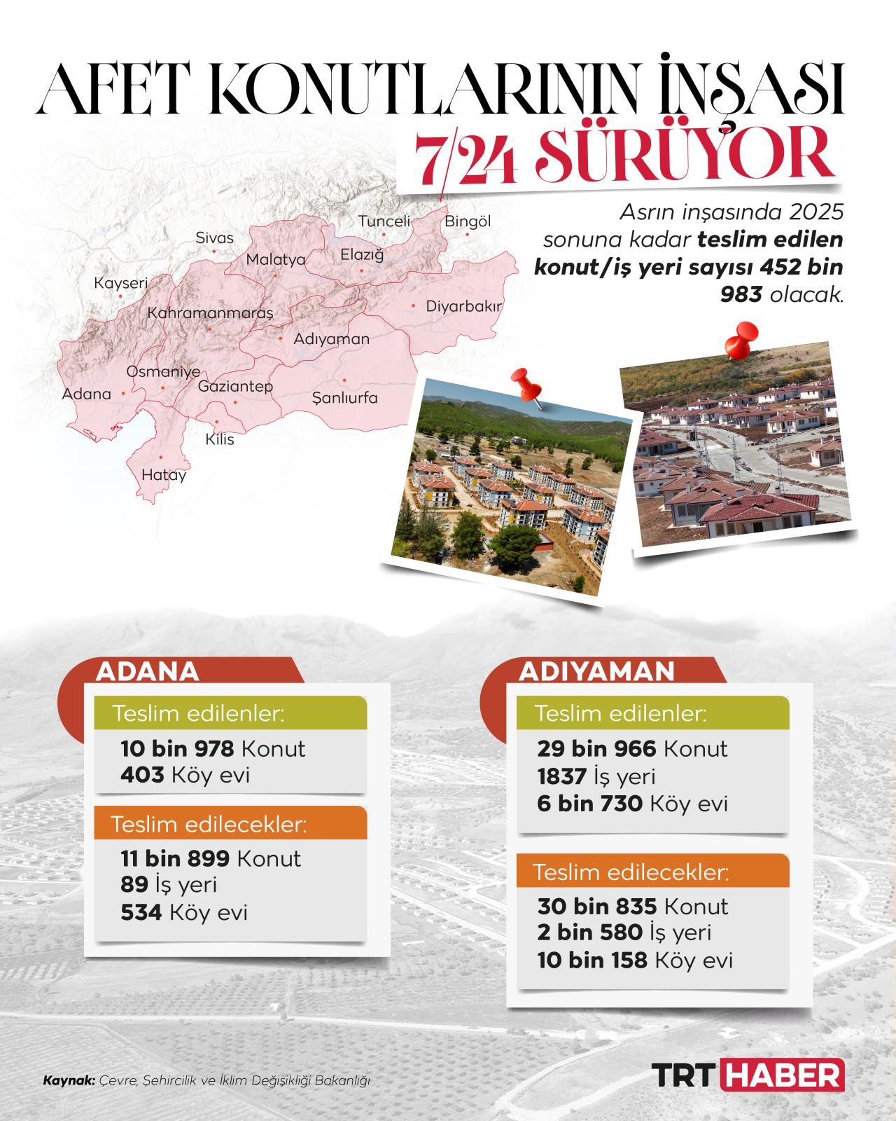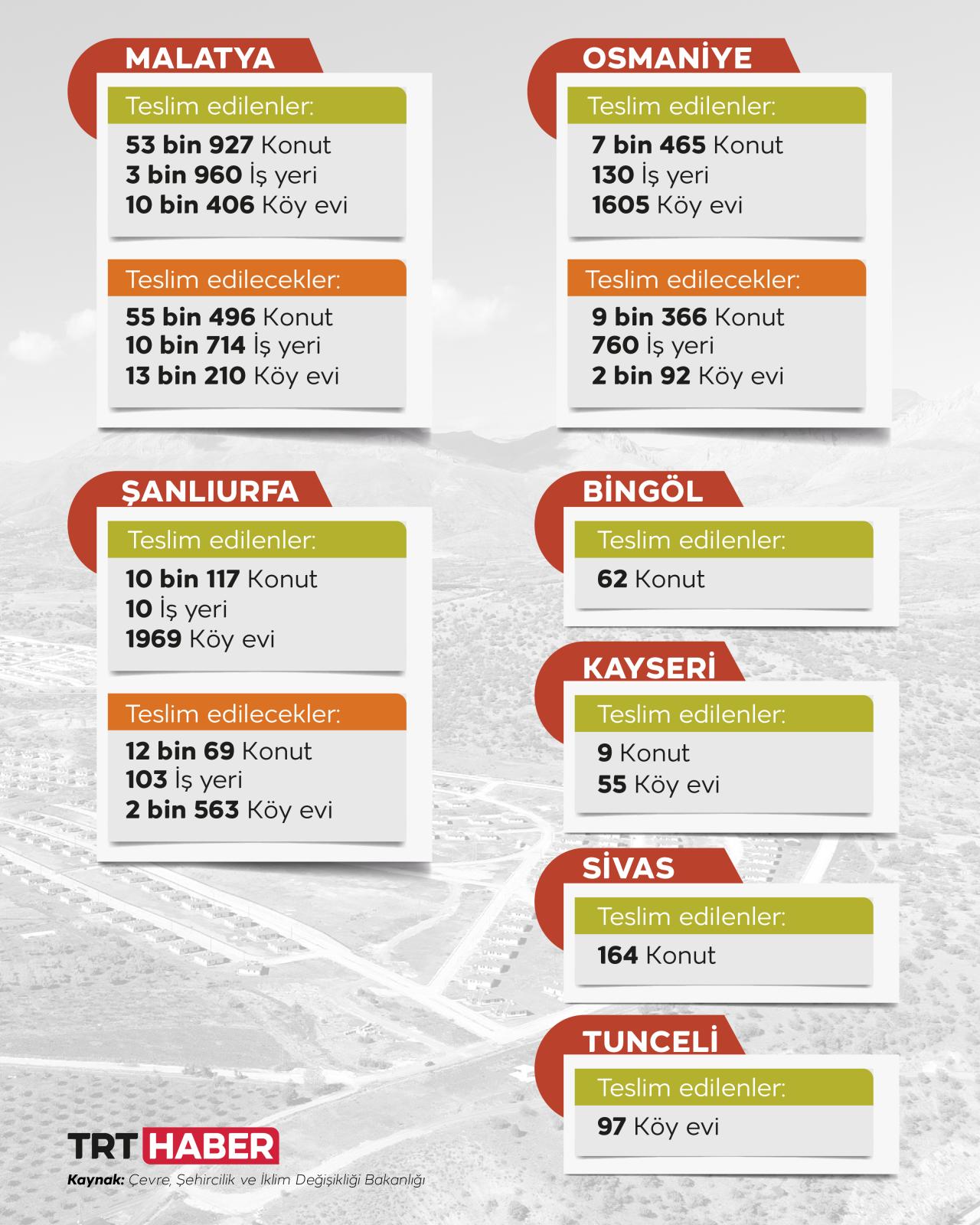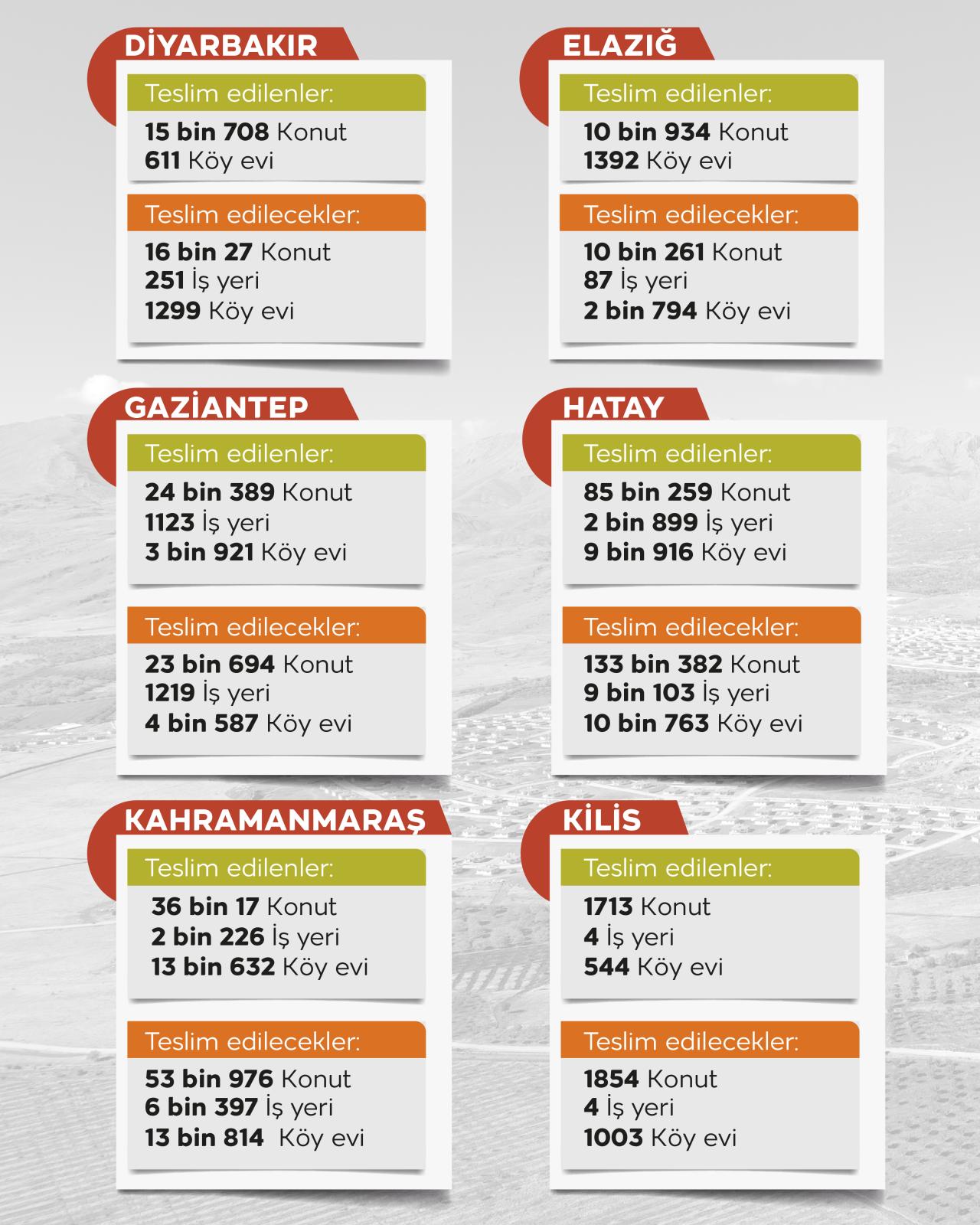 Asrın inşası 7/24 devam ediyor. 350 bin afet konutu ve iş yeri teslim edildi. Bu sayı, yıl sonunda 452 bin 932'ye yükselecek. İşte deprem bölgesindeki son durum.